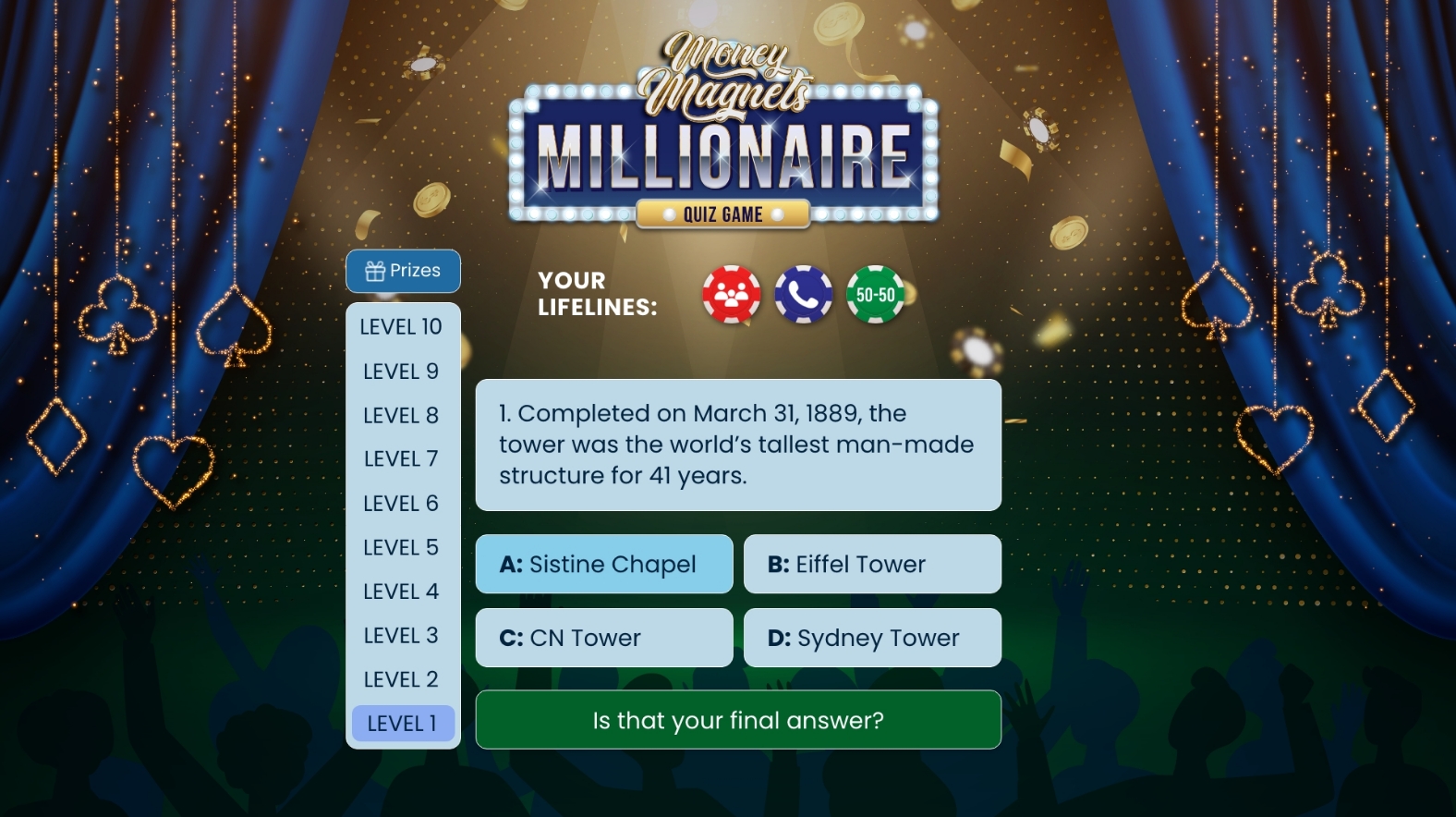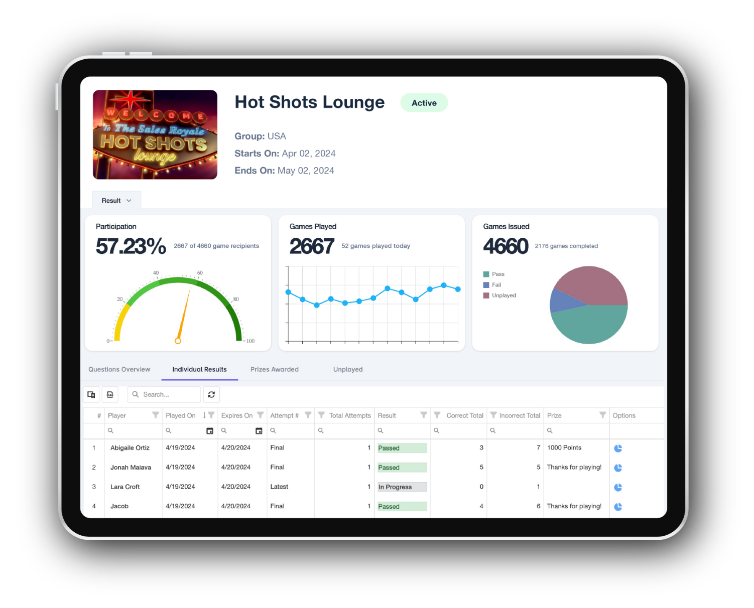 One Micro-learning Game remove One Sales Performance-based Game One Poll Game remove Prizing Options Ideal for Learn & Earn, New Product Launch, Milestone attainment, Sales Kick-Off, Onboarding new reps., etc. The Hot Shots Lounge Mission is fully customizable to your content and objectives, with prizes and odds to fit your budget. Step into the vibrant world of the Hot Shots Lounge, where your sales skills unlock thrilling gameplay opportunities! Dive into the Millionaire Quiz, test your luck with the Slot Machine, and try your hand at the Scratch & Win game—all while stacking up chances to win incredible prizes. The more you learn and sell, the more fun and rewards await in this high-stakes adventure!