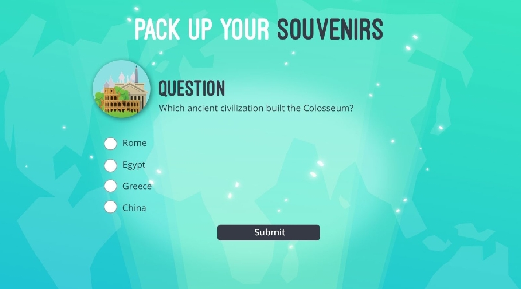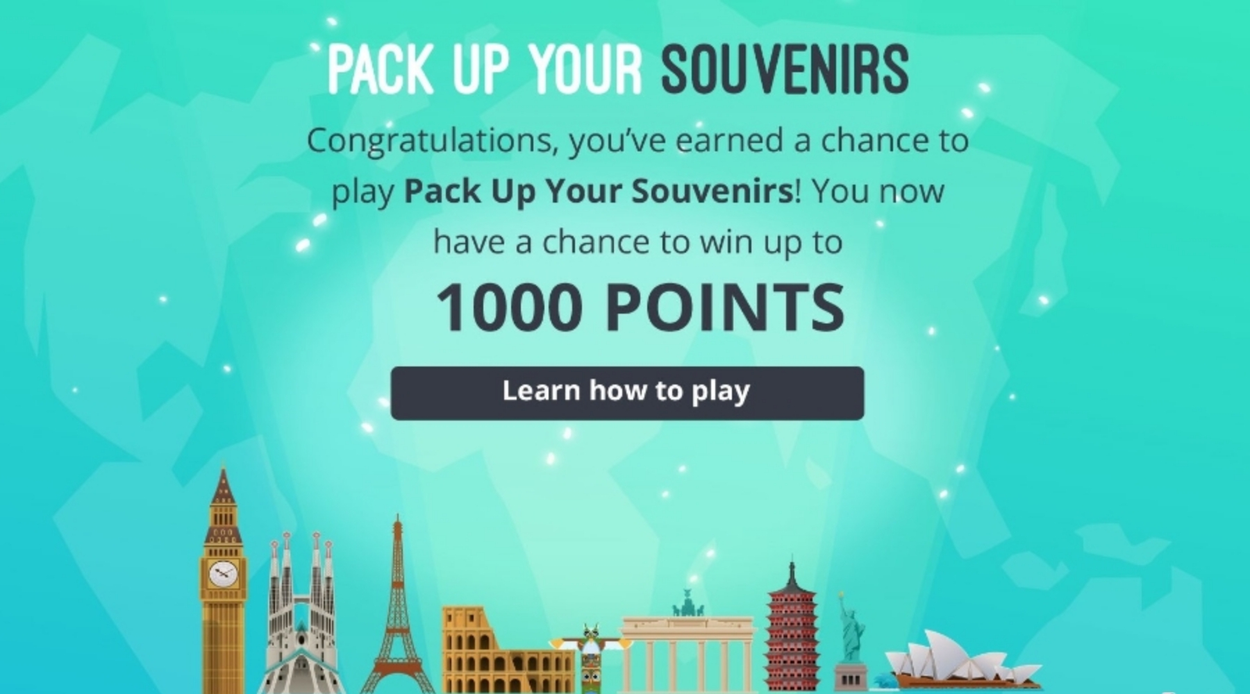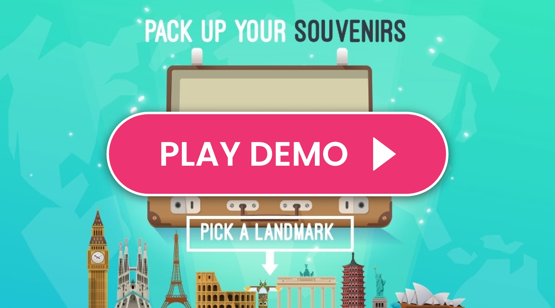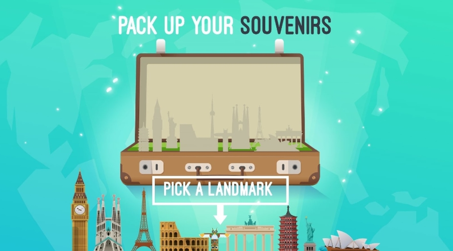 play demo Knowledge Gamepack it up!get your own custom versionoptions:done_outline Custom Graphics done_outline Your Own Questions And Answers done_outline Multiple Languages done_outline Winning Odds, Conditions And PrizesJust provide the questions, answers and prizes, and we’ll get you up and running in no time.HOW IT WORKSPlayers select an object, correctly answer a question around your product or service, and then see the landmark added to their suitcase. Up to 10 multiple choice questions on a topic of your choice. The correct answer with explanation is provided after each selection. Once all questions have been correctly answered, players have a chance to win points, or a prize of your choice, or an entry for a grand prize.